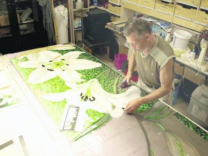 Показує у майстерні біло-зелене панно з лілеями. Тичинки — з об'ємного скла.