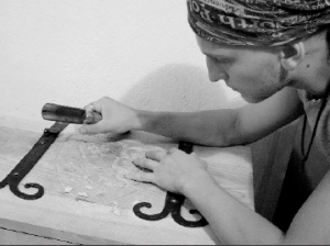 — Був у нас один замовник, хотів трухляву скриню. То ми її обробили мідним купоросом й кинули в багаття. Потім дістали, пошліфували. Був задоволений. Побиту робили. Металевою щіткою знімали верхні шари деревини. Так вийшло, наче скриня від ударів обсипалася. Замість шашелю в нас погнуті цвяхи. Пристукуєш їх до дерева, й залишаються покривлені борозни, наче короїд полазив. Для кращого ефекту беру різної товщини цвяхи й б'ю під різними нахилами, бо у природи нема нічого однакового.
