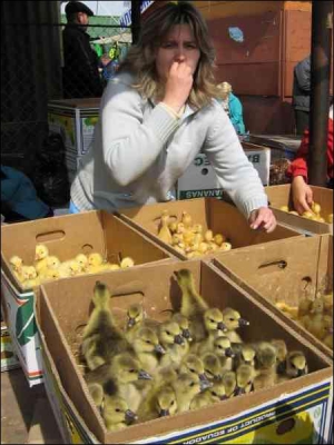 Поряд гусенятами і каченятами торгують 23-річна Катерина Гаврильєва і 29-річна Ірина Цокало. Катерина продає миргородську породу гусей за 17 грн, італійську — за 12, горьківську — за 10. Добових каченят по 4 грн.
