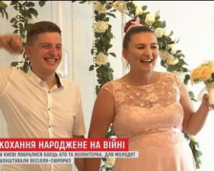 У с. Гнідин Бориспільського району на Київщині побралися один із наймолодших бійців АТО Андрій на псевдо "Кінь" і волонтерка Маруся Добра. Пара хотіла тихенько розписатись. Але друзі влаштували для них святковий сюрприз.