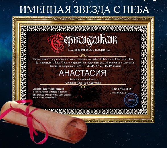 Зірка з неба. Сьогодні існує чимало "зоряних" агентств, що торгують небесними світилами. Варто лише вибрати сузір'я, величину зірочки і назвати її ім'ям своєї половинки. Нову назву зареєструють у спеціальному астрологічному каталозі. Але перед тим, як купувати, слід пересвідчитися, що зірка ще не зайнята та має лише буквено-цифровий код. Послуга коштує від 500 до 3 тисяч гривень. Після цього вам видадуть відповідну схему пошуку вашої зірки, сертифікат та астрономічний глосарій.