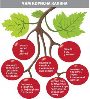 Калину слід заготовляти після заморозків, щоб стала солодша. Вона містить багато магнію, міді, заліза, що допомагають відновити організм після фізичної роботи чи хронічної втоми.