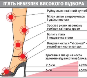 — Через підбори зростає навантаження на коліна, гомілки, трохи на тазостегновий суглоб. Також на стопу і пальці ноги. Виступають "кісточки". Може бути запалення, набряки. Підбори порушують природне положення м'язів. Це помітно по литці, коли жінка взуває інше взуття. Це ніби прийти в зал і качати лише одну частину тіла. Виходите на пляж — ноги худі, а торс перекачаний.