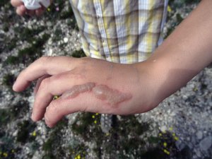 — Пішли збирати суницю і натрапили на гігантські зарості борщівника. Стебла були до трьох метрів у висоту, — розповідає Віталіна Марушко, 43 роки, з села Турчинівка Чуднівського району Житомирської області. — Щоб пройти на галявину, відгортала стебла руками. Від цього долоні почало пекти. Поки доїхала додому, жахнулася. Обидві руки напухли, шкіра пекла і пульсувала, утворилися пухирі завбільшки як виноградини.