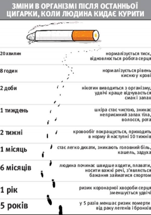 Фізична залежність від паління минає за два-три дні, пояснює 31-річний психолог Артем Ступаков із громадського руху "Твереза Україна". За цей час організм очищується від нікотину. Психологічно людина відвикає довго. Більшість курців замінюють цигарки їжею.