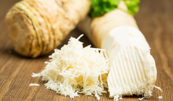 Натерти хрін на дрібній тертці, трохи пріперчіть і посолити, за бажанням додати сметани.