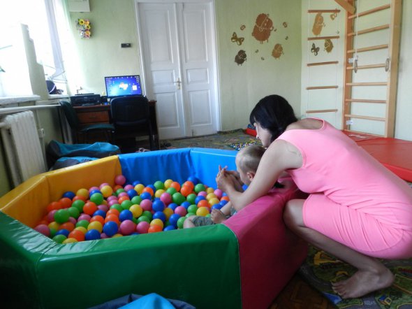 "Моє завдання – допомогти навчитись зосереджуватись, концентрувати увагу, слухати, те, що кажуть", – пояснює Катерина Гаврилюк і переводить Дмитра до кімнати лікувальної фізкультури. Тут є шведська стінка, ортопедичні килими, фітболи, м'який конструктор, невеликий батут, "сухий дощ" (підвішений великий вінок з кольоровими стрічками. - Газета), намет з тунелем та сухий басейн з м'ячами.