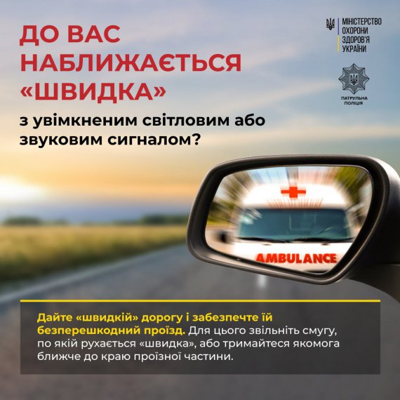 Якщо до вас наближається "швидка" з увімкненим світловим і звуковим або лише світловим сигналом, дайте їй дорогу і забезпечте безперешкодний проїзд.