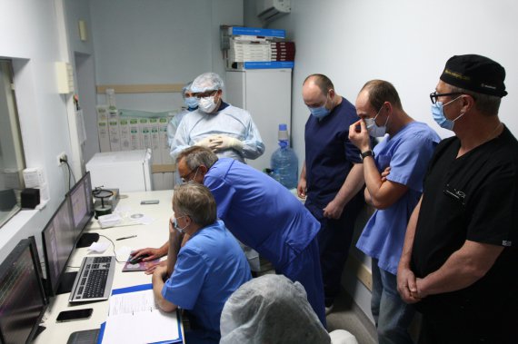 З десяток лікарів збирається перед процедурою на консиліум у пультовій. Це, по суті, частина операційної, з великим вікном у зону, де проводять втручання. На чотирьох моніторах виведені кардіограма, тиск, сатурація і зображення серця пацієнта. Усе в реальному часі.