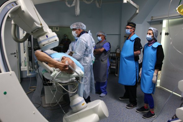 "Зазвичай процедуру проводить інтервенційний кардіохірург, медсестра операційна, анестезіолог і сестра анастезіалістка. Іноді є лікар асистент. Сьогодні консультує П'єр Левіс", - говорить Євген Марушко, вказуючи поглядом на швейцарського лікаря – той у сірому захисному костюмі, склавши руки попереду себе, спостерігає за ходом втручання. В той час пацієнту зробили маленький надріз на правій руці. Через нього вводитимуть стент.