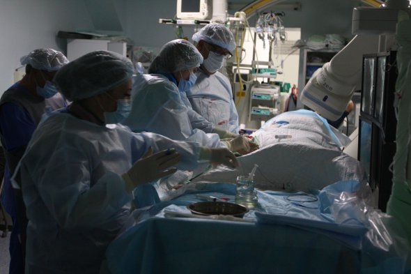 "Счас может заболеть сердце". Інший хірург прокручує у руках великий білий шприц. На моніторах спостерігають, як просувається по судинах інструментарій. Робота медперсоналу злагоджена. Чітка.