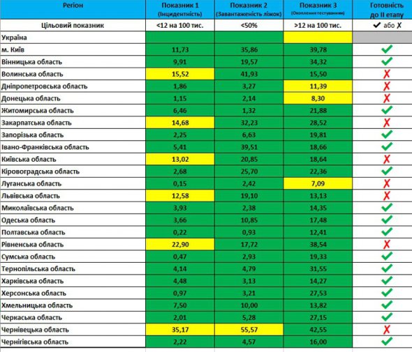 Карантин послаблюється у регіонах, які відповідають трьом критеріям: мають не більше 12 хворих на 100 тис населення за останні 7 днів, ліжка у лікарнях заповнені максимум на 50%, тестується щонайменше 12 людей на кожні 100 тис населення. Якщо область не відповідає одному чи більше критеріям — послаблення там зніматися не повинні.