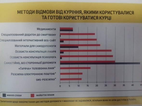"Відповідно до результатів дослідження стало відомо, що 1,5 мільйони українців щороку роблять спроби кинути курити. Їм потрібна крім власних мотивів, зовнішня допомога. На сьогодні в Україні її немає, тому ми маємо докласти зусиль для її створення", - каже Наталія.