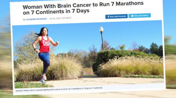 Після 12-ти років боротьби з раком мозку американка Бетхан Телфорд буде бігати марафон "World Marathon Challenge 2017". Під час акції учасники мають пробігти 23,6 тисяч міль та пролетять 59 годин на літаках. Розповідає tvp.info.