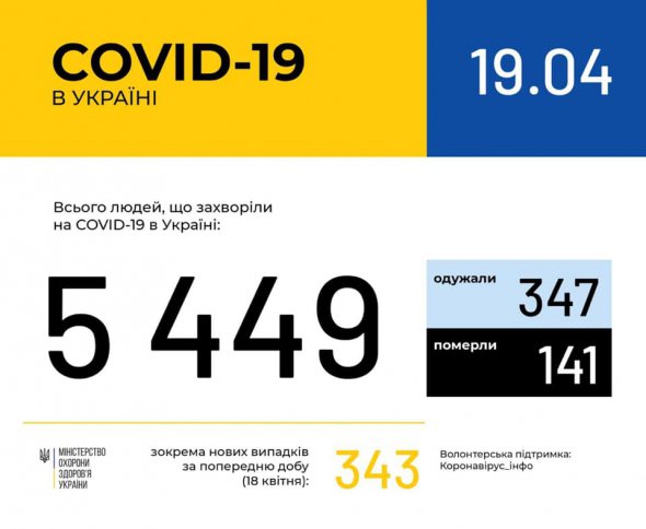 Станом на 9:00 19 квітня в Україні 141 летальний випадок, 347 пацієнтів одужали. За добу зафіксовано 343 нові захворювань, повідомили в МОЗ.