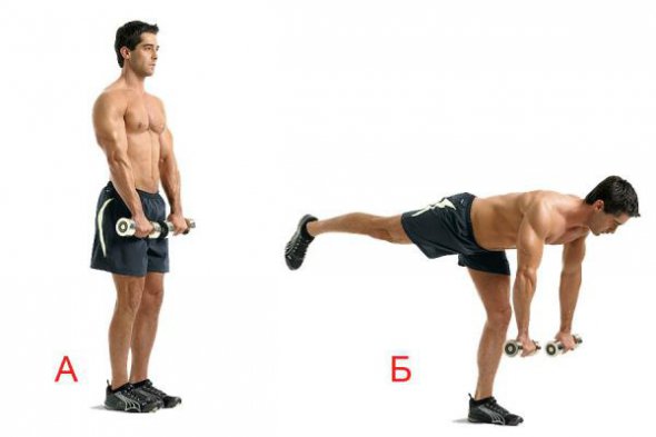 Станьте на праву ногу, ліву, зігнуту в коліні, підніміть перед собою. Тримайте коліно на рівні стегон. Потім повільно нахиляйтеся вперед, спробуйте торкнутися прямими руками підлоги, при цьому відводите ліву ногу назад і випрямляєте її.