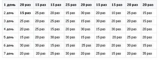 Тиждень - це мінімальний термін, за який можна позбавитися від живота і боків, тому зробіть для себе розклад вправ згідно з вашим робочим графіком. На допомогу собі можете використовувати цю таблицю. Кожен день в шість підходів качайте прес (класичним способом).