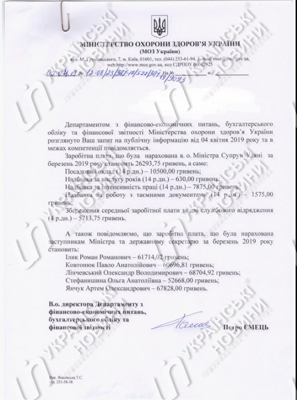 Сума коштів, нарахована Супрун у березні, склала 26 294 грн, із яких посадовий оклад — 10 500 грн. Надбавка за вислугу років — 630 грн, надбавка за інтенсивність праці — 7 875 грн, надбавка за роботу з секретними документами — 1 575 грн, відрядження — 5 714 грн.