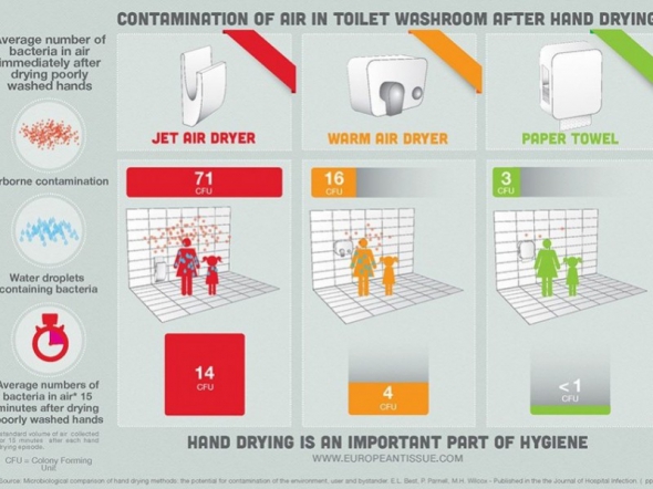 З цього зробили висновок, що люди, які користуються пристроями для сушіння рук, розкидають свої бактерії та збудники хвороб під потоком теплого повітря, а також збирають чужі. Річ у тому, що віруси, бактерії та гриби добре зберігаються у теплому вологому повітрі та не гинуть щонайменше 15 хвилин. Це стосується вірусу грипу, стрептококів, стафілококів, кишкової палички та пневмонії.