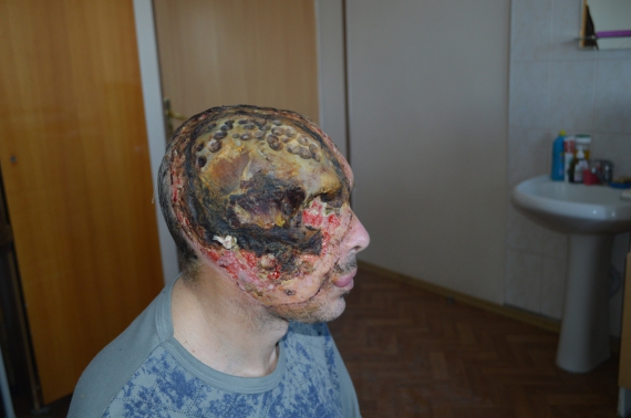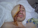 "На нього впала плита. Або розпечена якась поверхня. Він сам про це не пам'ятає. Це те, що ми здогадуємось, що могло статися з нашого досвіду роботи з пацієнтами. У нього випалена зіниця, немає вуха. Але найбільш небезпечно - що не було великої ділянки шкіри. Була відкрита глазниця, гайморові пазухи, вражена повністю кістка, частина черепа. Загинули частини обличчя - уся шкіра, клітчатка підшкірна. Як він вижив, я, як лікар не можу сказати", - розповідає хірург інституту Шалімова.