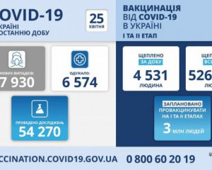 За добу щеплення отримали 4531 людина. Загалом, в Україні щеплено майже 527 тис. людей. Із них практично всі однією дозою. Завершили вакцинацію, отримавши дві дози – п'ять осіб. Із них дві особи отримали одну дозу за кордоном. Станом на 24 квітня до листа очікування вакцинації записались майже пів мільйона громадян України.