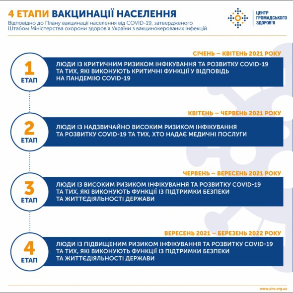 1) січень–квітень 2021 року — люди з найвищим ризиком інфікування та розвитку коронавірусу і ті, хто виконує критичні функції в боротьбі з пандемією;