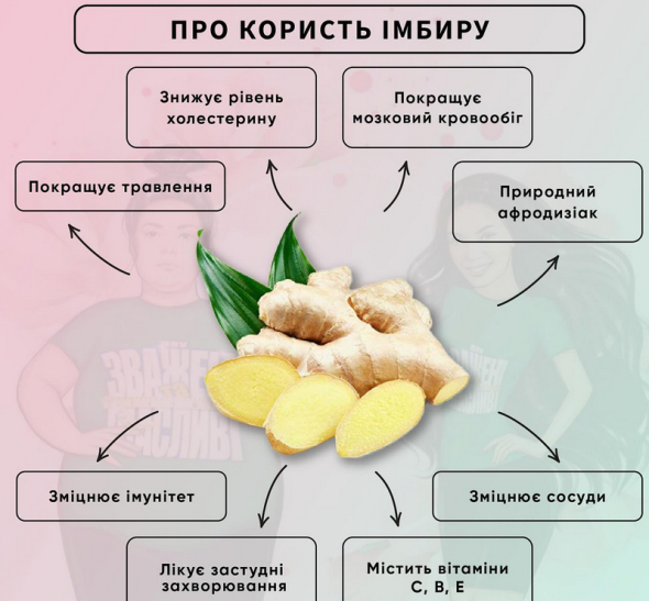 Покращення травлення. Імбир стимулює виділення шлункового соку, що сприяє кращому засвоєнню їжі. Він також допомагає боротися з здуттям живота та запобігає затримці рідини, що часто є однією з причин збільшення ваги.
