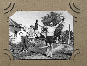 – А на шо ж їм дивиться? Телевізорів не було. Якось улітку вийшов із молотом, а тут сусідські діти бігають. Для сміху вхопив одного за ногу. Молот понад 7 кілограмів важить і Івась десь так само – вийшла противага. Поряд у підкачаних штанцях – племінник мій Пашка. Нема вже його – помер від горілки. А сфотографував нас хтось із сусідів.