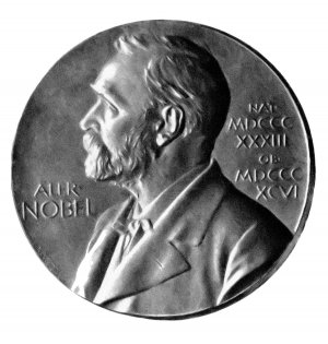 Медаль лауреата Нобелівської премії. На ній викарбувано профіль засновника відзнаки Альфреда Нобеля. До 1980 року нагороду робили із золота. Зараз її додають срібло й незначну кількість міді. Важить 175 грамів