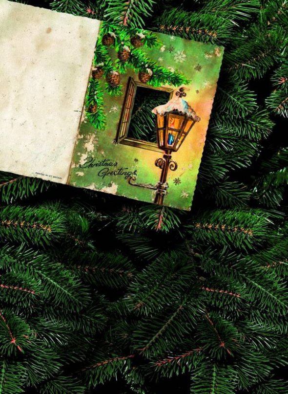 Цю листівку-розкладачку з Великої Британії кілька років тому знайшов серед старих новорічних прикрас для ялинки на горищі татової хати. Жили у селі Стриганці Бережанського району Тернопільської області. У нижньому лівому куточку напис англійською – Christmas Greetings – "Різдвяні вітання". Має "срібні" вставки. У Радянському Союзі таких не виготовляли. Листівка виглядала настільки красиво, що в дитинстві ми чіпляли її на ялинку.