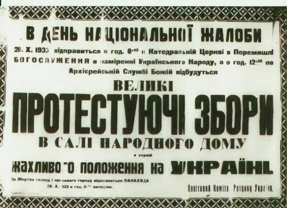 "Україна в передсмертних судорогах! – таку відозву поширює у галицькій пресі греко-католицький митрополит Андрей Шептицький 24 липня 1933 року. – Населення вимирає голодовою смертю. Оперта на несправедливості, обмані, безбожництві та деправації, людоїдна система державного капіталізму довела багатий нещодавно край до повної руїни".