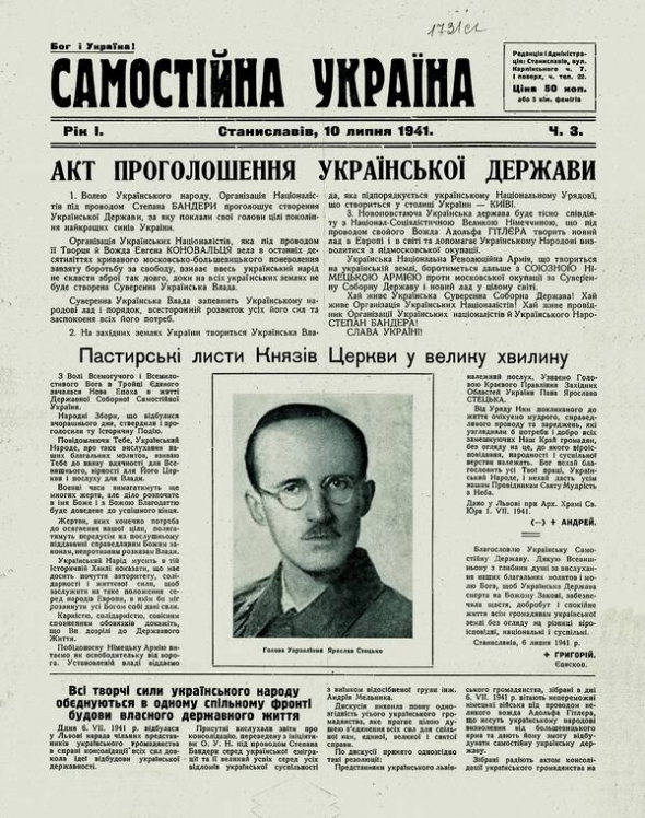 "Волею українського народу, Організація українських націоналістів під проводом Степана Бандери проголошує відновлення Української Держави, за яку поклали свої голови цілі покоління найкращих синів України", – так починається "Акт проголошення Української Держави", прийнятий у Львові 30 червня 1941 року.