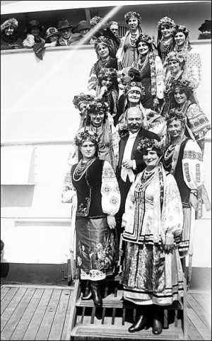 За кордон виїхали у квітні. Перед виїздом купили в якогось отамана-грузина 50 пудів цукру й круп. До Праги прибули як банда: хористи в шинелях, хористки в папахах і чоботях. Кошиць — у чужому пальті з рукавами до ліктя і ясно-зеленому позиченому капелюсі. Не виходили з готелю, доки пристойно не одяглися — 130 тис. крон позичив посол Української Народної Республіки у Празі Микола Славінський.