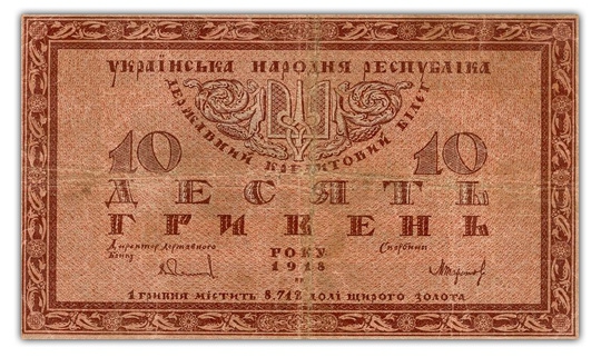 Протягом 1918 року в Берліні видрукувано грошові знаки номіналом 2, 10, 100, 500, 1000 і 2000 гривень. Ескіз першої купюри, прикрашеної простим геометричним орнаментом, виконав Василь Кричевський, трьох наступних - Георгій Нарбут. В ескізі 10-гривневої купюри Нарбут використав орнаменти українських книжкових гравюр XVII століття, 100-гривневої - зображення робітника з молотом та селянки з серпом на тлі розкішного вінка з квітів і плодів, 500-гривневої - свою улюблену алегорію "Молода Україна" у вигляді осяяної дівочої голівки у вінку.