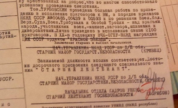 "Свою роботу знає добре. Уміло організував охорону й ізоляцію ув'язнених внутрішньої в'язниці УГБ УНКВС, а також доставку заарештованих на допити з Дніпропетровської в'язниці, що багато в чому сприяло успішності слідства. Товаришем Турбовським безпосередньо проведена велика робота з приведення до виконання вироків до ВМ, у порядку наказів народного комісара внутрішніх справ СРСР і за рішенням Колегії Верховного суду Військового трибуналу й Особливої "трійки" при УНКВС над ворогами народу, учасниками військово-фашистської змови, шпигунами і диверсантами. Особисто приведено до виконання понад 2100 вироків", - навів у Facebook текст зі справи російський дослідник Костянтин Богуславський.