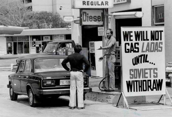 "Лада" не обслуговується, поки Совєти не підуть з Афганістану. Власник бензоколонки відмовляється заправляти радянську "Ладу" через вторгнення в Афганістан. Торонто, Канада, 1980 рік.