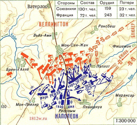 Він 72 тисячі військових направив проти 68-тисячної армії герцога Веллінгтона, котра зайняла оборонні позиції поблизу селища Ватерлоо, за 20 кілометрів на південь від Брюсселю.
