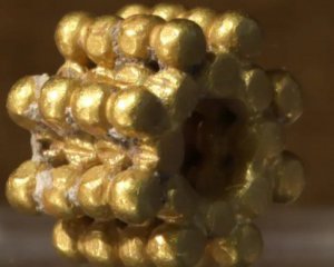 Давні майстри виготовили артефакт із маленьких золотих кульок та надали йому вигляду квітки. Таку технологію називають гранулюванням.