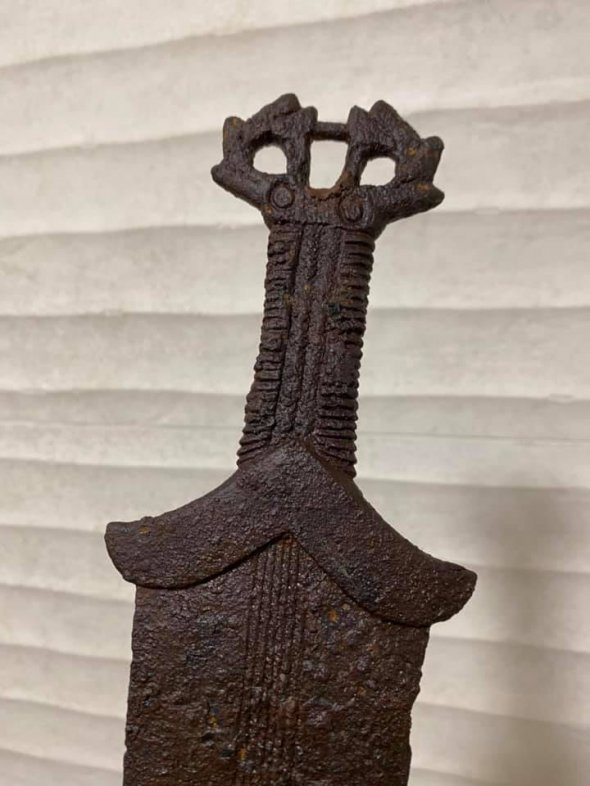 Також на фотографії видно, що окрім меча вдалося знайти й вістря давнього списа.