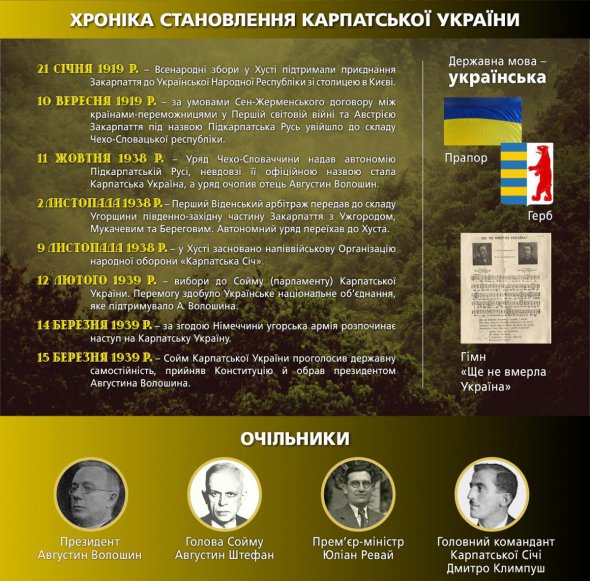 15 березня 1939 року перше засідання Сойму у Хусті проголосило незалежність Карпатської України та прийняло Конституцію.