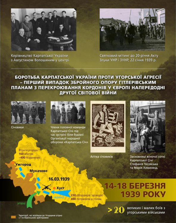 Карпатська Україна займала гірську територію Закарпаття. Мукачево та Ужгород окупувала Угорщина з дозволу Третього Рейху. Учасники напіввійськової організації "Карпатська Січ" чинили спротив угорцям. Це стало першим випадком збройного опору гітлерівським планам з перекроювання кордонів у Європі напередодні Другої світової війни.