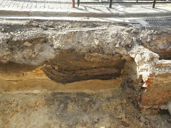 "Бруківка, мабуть, повоєнна, чув, що такі дороги робили полонені німці. І ось, біля кафе "Хряк", на розі вулиць Київської та П'ятницької, в стінах траншеї знайшли об'єкти часів Київської Русі", - каже Ігнатенко.