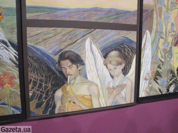 В центрі картини зображені два янголи. Чорний з сопілкою зовні дуже схожий на Павла Тичину. Ким є смиренний білий янгол до недавна лишалося невідомим. Згодом у ньому впізнали дочку письменника Івана Коновала (Воронківського) Поліну, яку покохав поет. Однак у Тичину була закохана молодша сестра Поліни Інна.