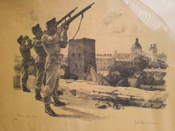 У 1916 році в празькому видавництві Lederer & Popper надрукували кольорову листівку, яку підписали : "Битва проти росіян біля Луцька" німецькою та угорською мовами. Автор малюнка поки невідомий.