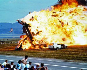 На голови людей летять бризки палаючого палива і розпечені уламки. На глядачів розливається понад 800 літрів палива із баків. Літак врізався в землю, за ним займаються фургони та автомобілі. Третій літак руйнується в повітрі. Усі три італійські пілоти гинуть.