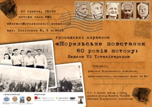 Сьогодні о 18 00 у Культурно-мистецькому центрі "Києво-могилянської академії" розпочнуться громадські слухання, приурочені до 60-річчя Норильського повстання — події, що, як стверджують деякі історики, великою мірою спричинила розпад СРСР. Лідери та свідки повстання, історики, інтелектуали, громадські діячі згадуватимуть події травня 1953 року в Норильську.