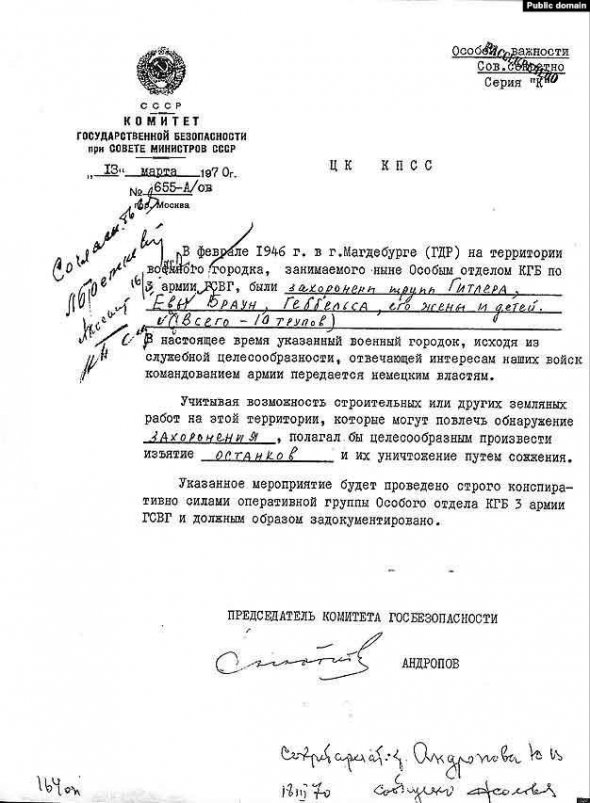 Тоді вказане військове містечко "виходячи з службової доцільності, що відповідає інтересам військ" передавали німецькій владі. В Москві вважали, що місце поховання Гітлера і може стати об'єктом поклоніння для прихильників його ідей. Тому останки Гітлера знищили.