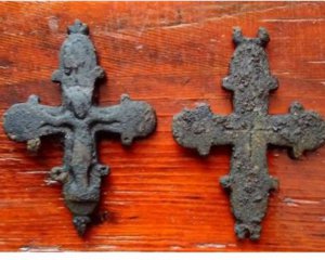 Бронзовий литий нагрудний хрест-складень ХІІ-ХІІІ ст. знайшли під час реставрації підлоги в храмі святої Параскеви у Буську на Львівщині. Будівельники виявили його у вівтарній частині.