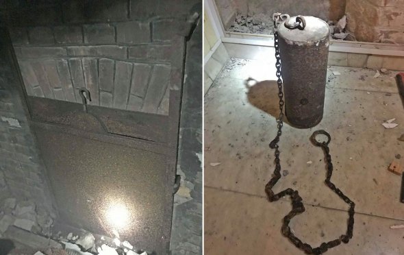 Всередині побачили металеву противагу з ланцюгом, яку використовувалися для автоматичного відкривання дверей печі.
