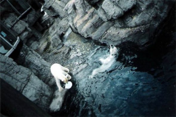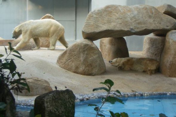 Інука (зліва) - талісман зоопарку в Сінгапурі. Він став першим із полярних ведмедів, що народився і виріс у тропіках. Зараз Інуці 23 роки. Він цілком комфортно почуває себе в зоопарку Сінгапуру.